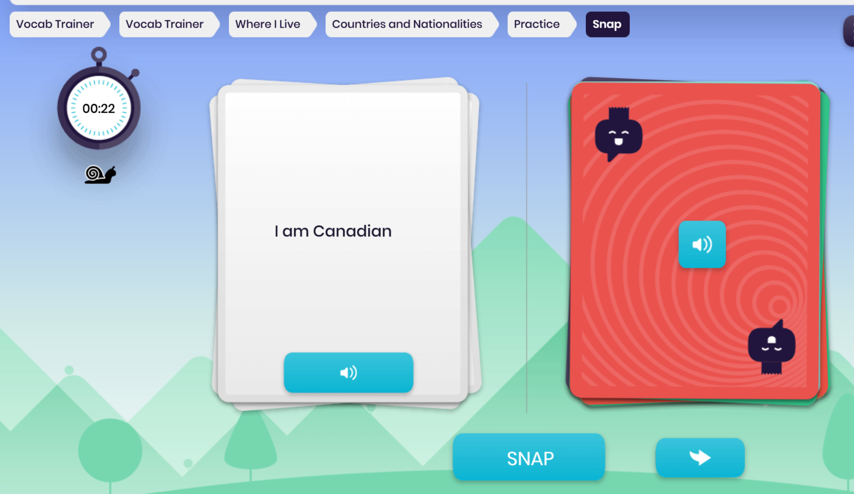 Listening Snap is a great way to energise the room. Project the game so students can see the support language, then use the arrow button to play the target language audio. When they hear a matching pair, students respond with a signal of your choice — stand up, sit down, hands up, anything that gets them involved.